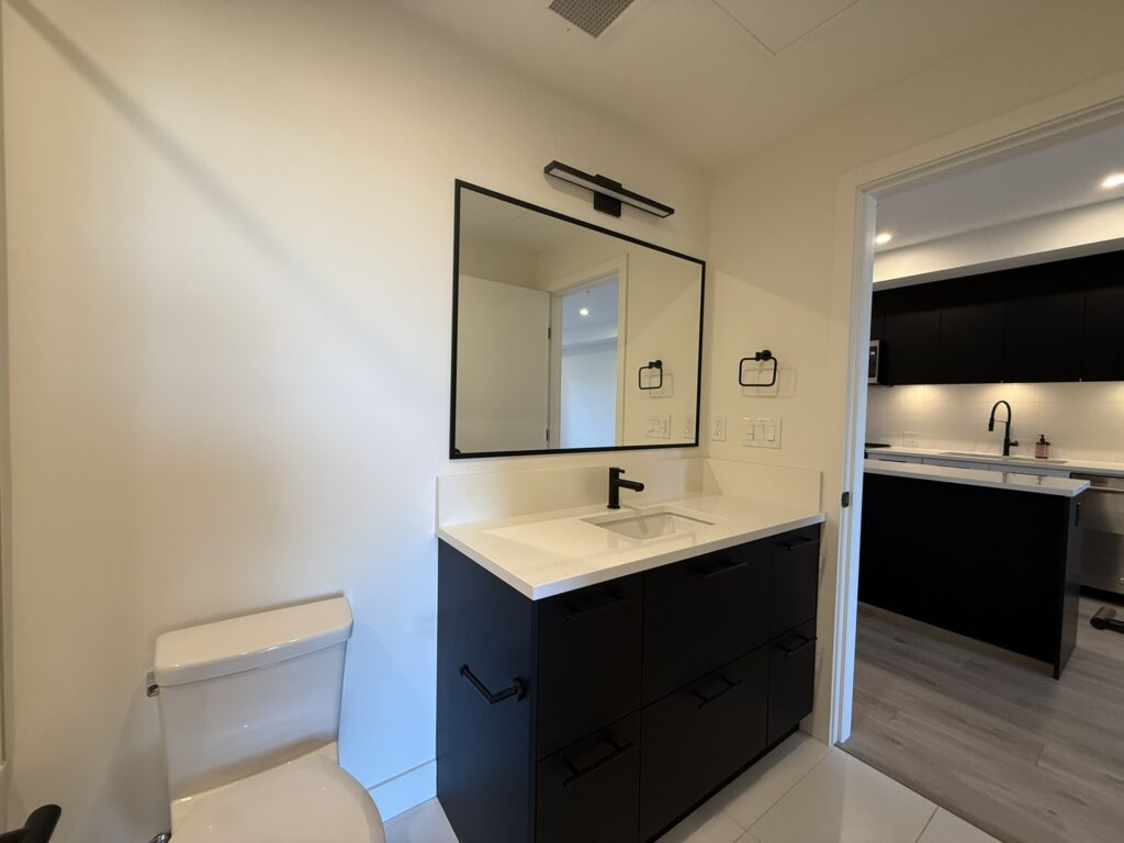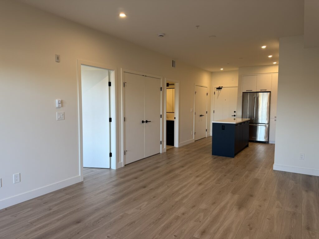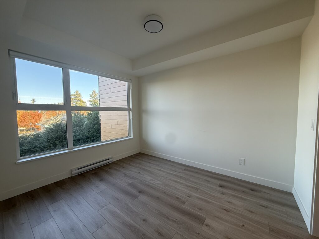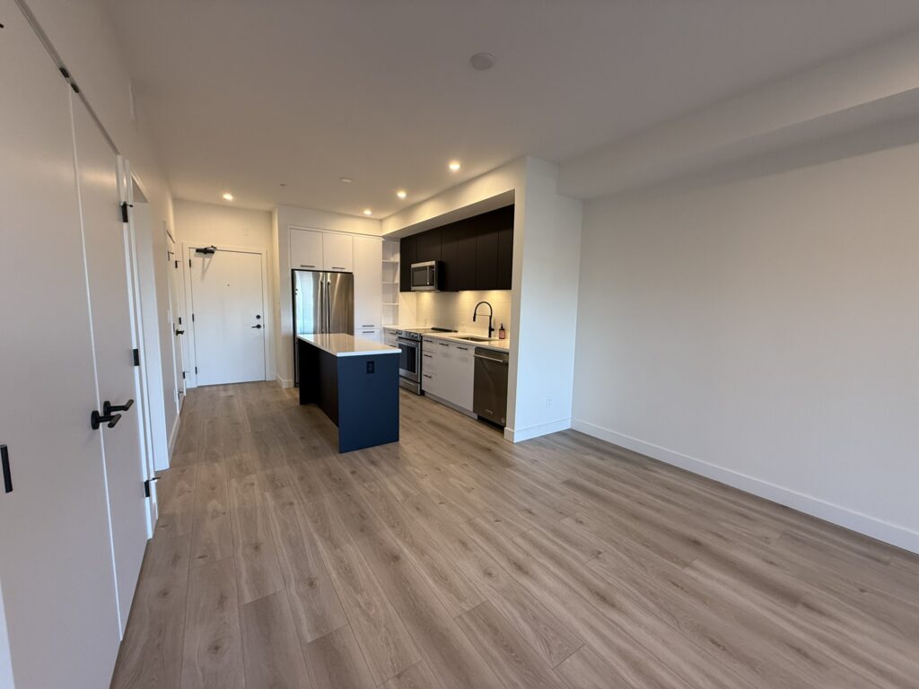 Odyssey, Brand New 1-Bedroom, 1-Bathroom, approx. 700 sq.ft. Interior Highlights: Open-concept, Full-sized stainless-steel appliances, black matte plumbing fixtures, white quartz counters with white tile backsplash, wide plank wood-grain laminate floors throughout, Whirlpool side-by-side washer & dryer in-suite, spacious bedroom with large walk-in closet, modern 4-piece bathroom with access from the bedroom and or kitchen. Private deck with serene views. State-of-the-art, Fitness Centre with sauna, fully equipped lounges, 24/7 security. Includes: 1 storage locker,1 parking, Bike storage available! Building Amenities: Sauna & steam room, Multiple resident lounges (perfect for remote work or entertaining), Rooftop patio (coming soon). Location Perks: Centrally located at King George Blvd & 152nd St, Steps to transit, shopping, restaurants, parks, and Easy access to Hwy 99 & major routes. Small pet negotiable. Mandatory insurance. No smoking or vaping. Rental Property Address: 212-2620 152 Street.Property Manager: Bernadine Nielsen.