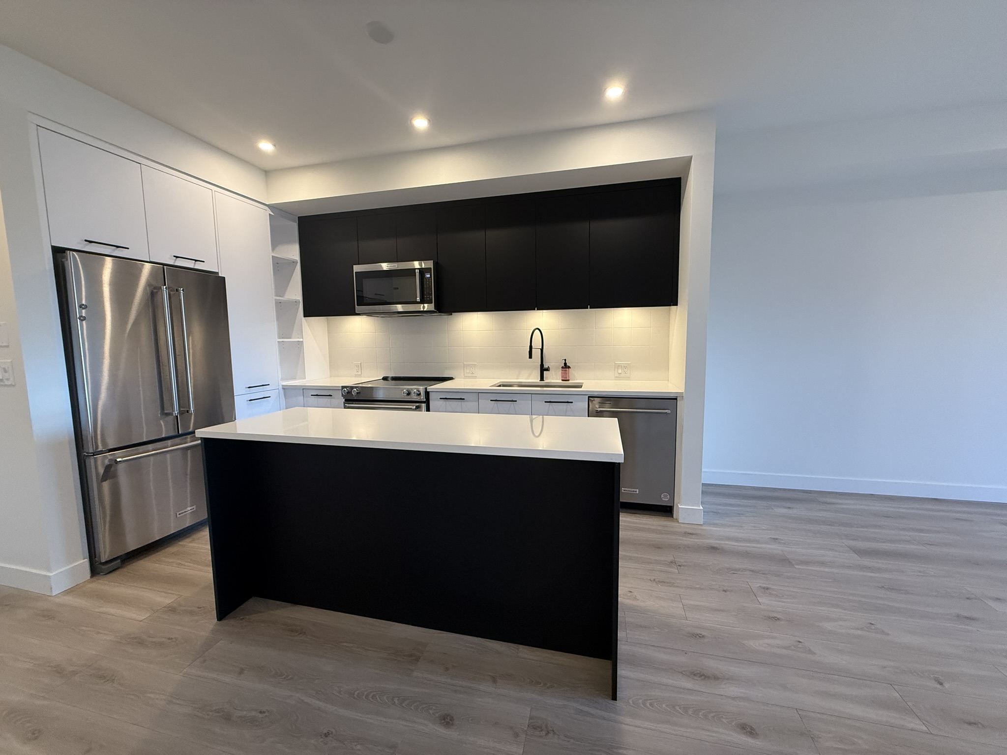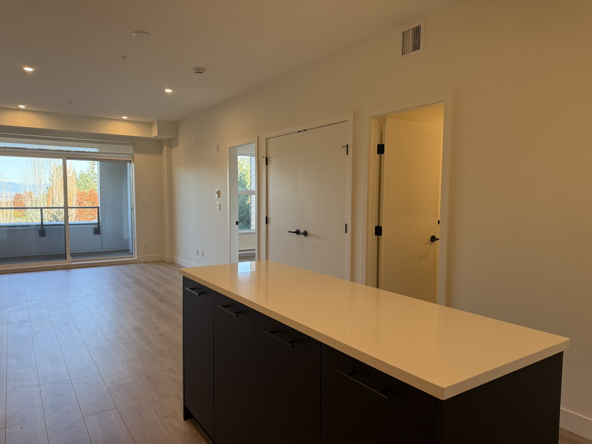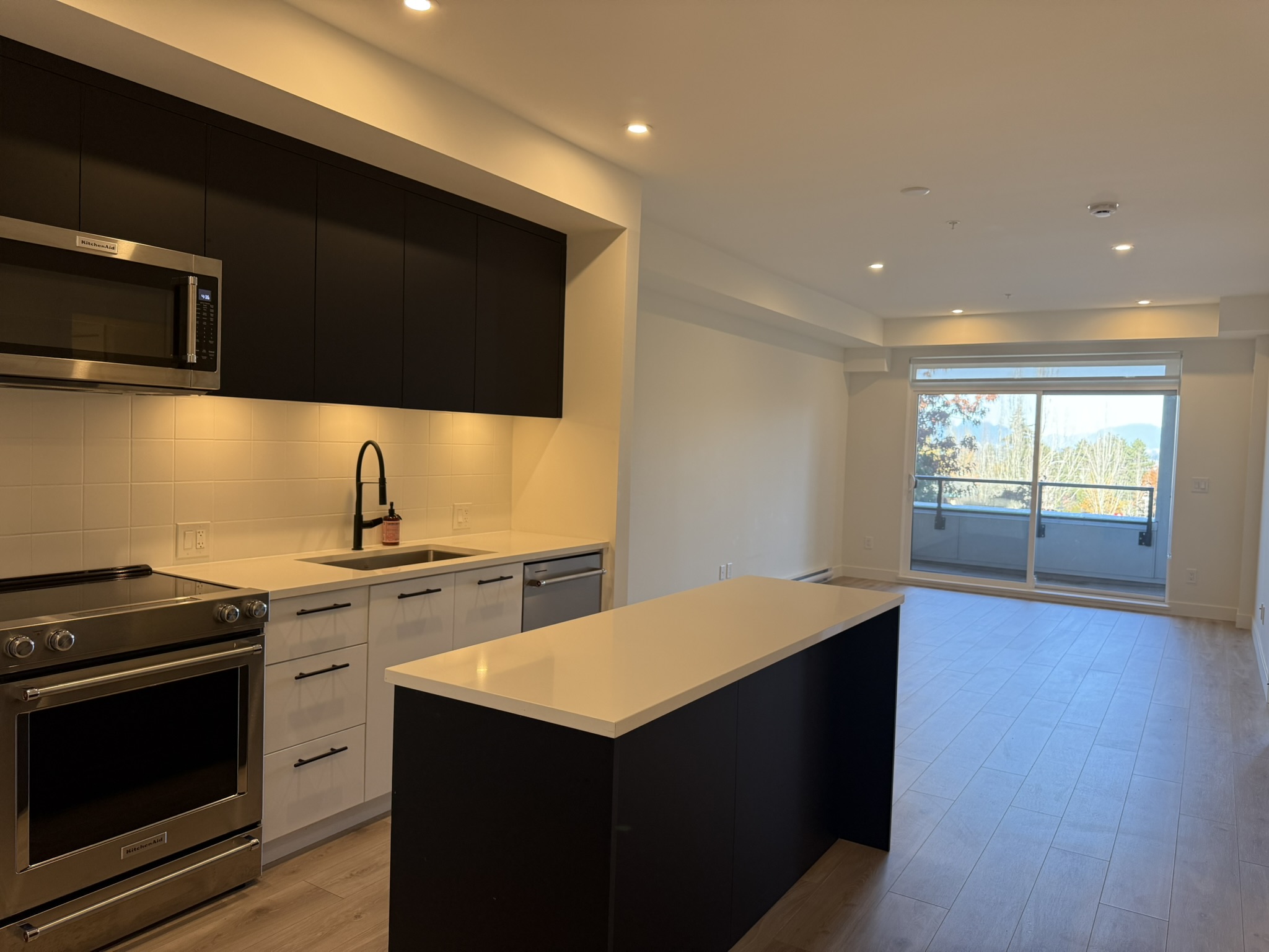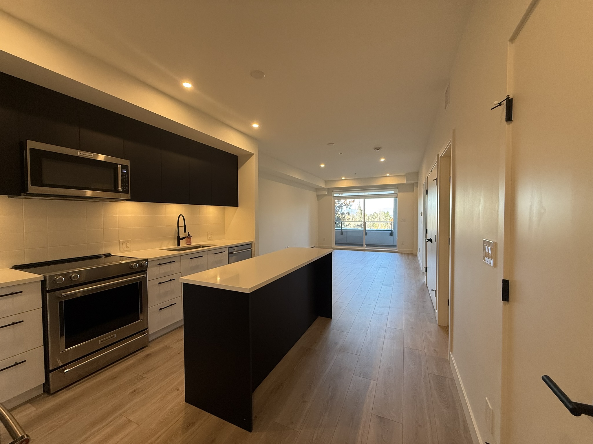 Odyssey, Brand New 1-Bedroom, 1-Bathroom, approx. 700 sq.ft. Interior Highlights: Open-concept, Full-sized stainless-steel appliances, black matte plumbing fixtures, white quartz counters with white tile backsplash, wide plank wood-grain laminate floors throughout, Whirlpool side-by-side washer & dryer in-suite, spacious bedroom with large walk-in closet, modern 4-piece bathroom with access from the bedroom and or kitchen. Private deck with serene views. State-of-the-art, Fitness Centre with sauna, fully equipped lounges, 24/7 security. Includes: 1 storage locker,1 parking, Bike storage available! Building Amenities: Sauna & steam room, Multiple resident lounges (perfect for remote work or entertaining), Rooftop patio (coming soon). Location Perks: Centrally located at King George Blvd & 152nd St, Steps to transit, shopping, restaurants, parks, and Easy access to Hwy 99 & major routes. Small pet negotiable. Mandatory insurance. No smoking or vaping. Rental Property Address: 212-2620 152 Street.Property Manager: Bernadine Nielsen.
