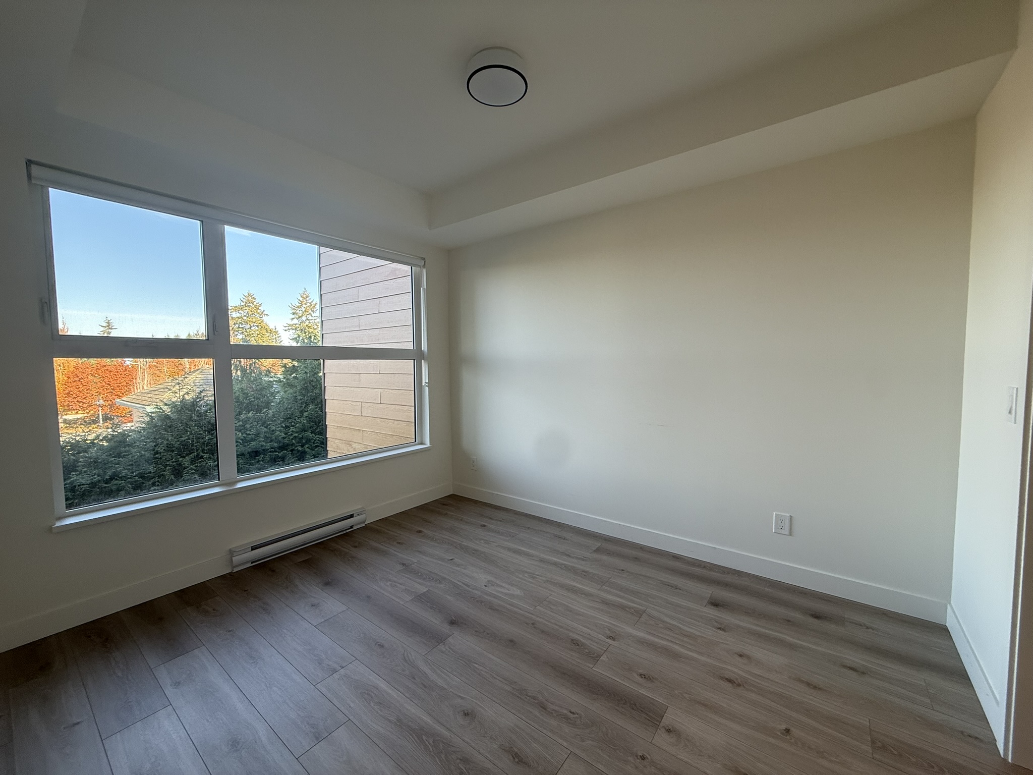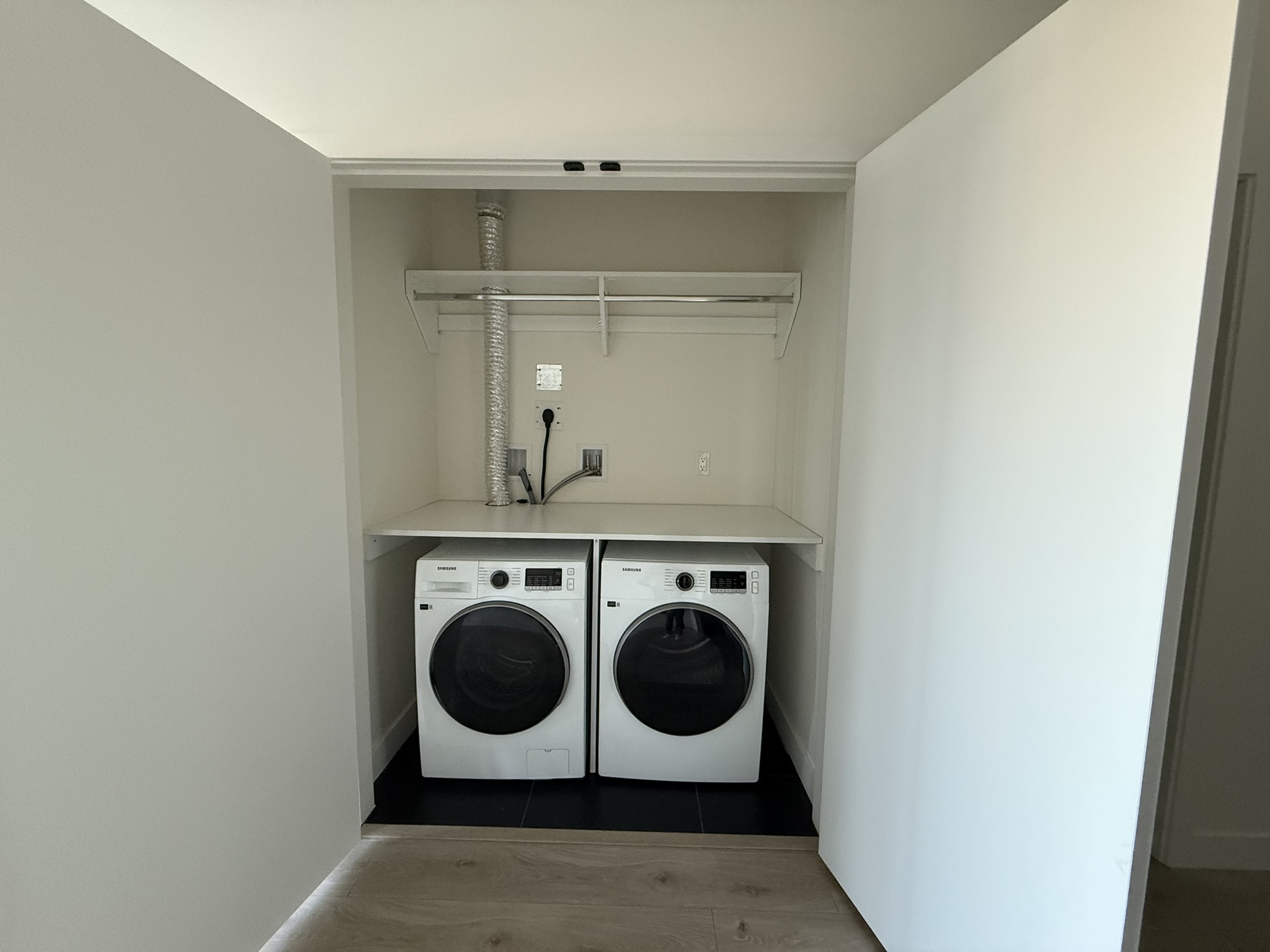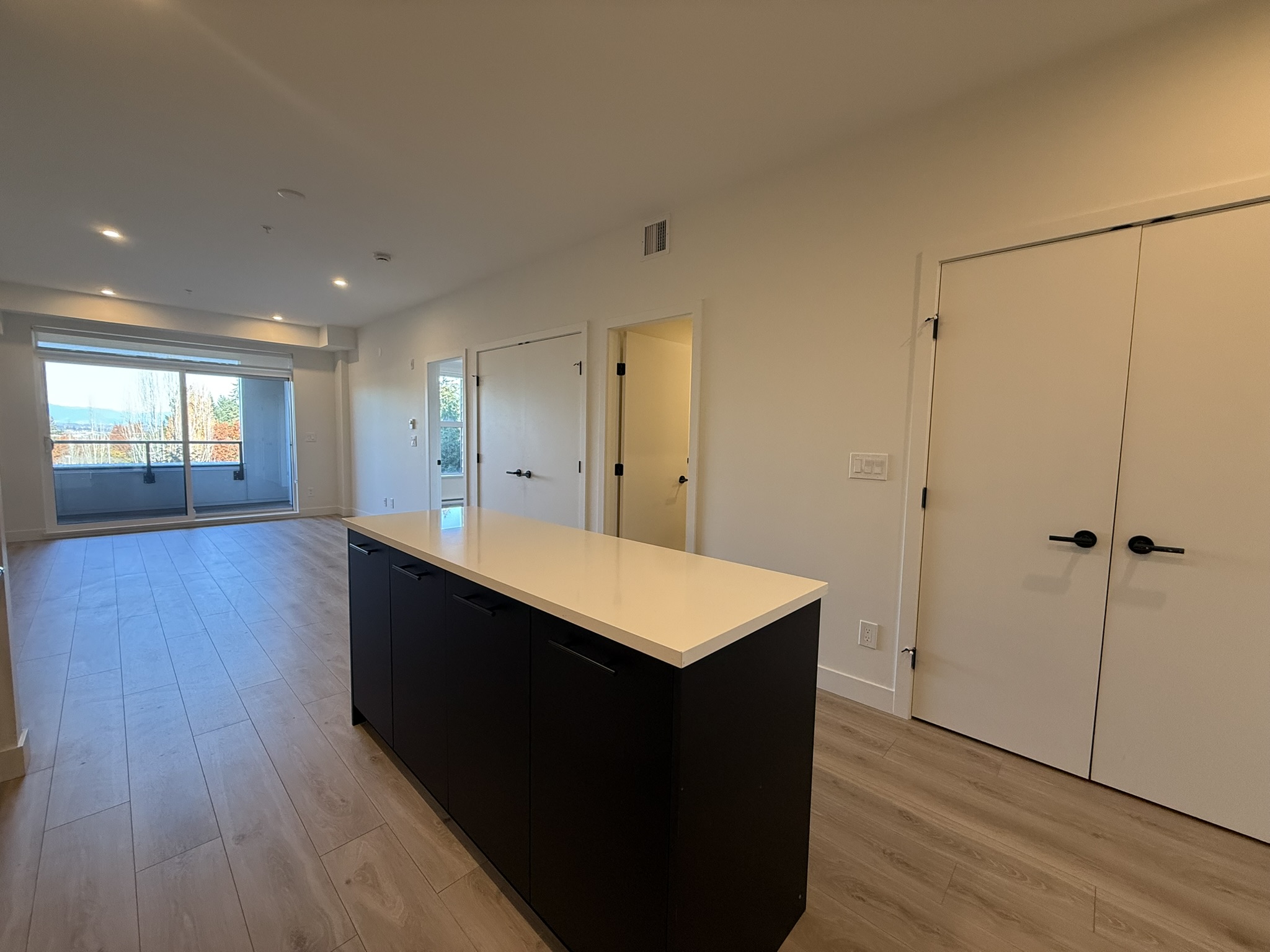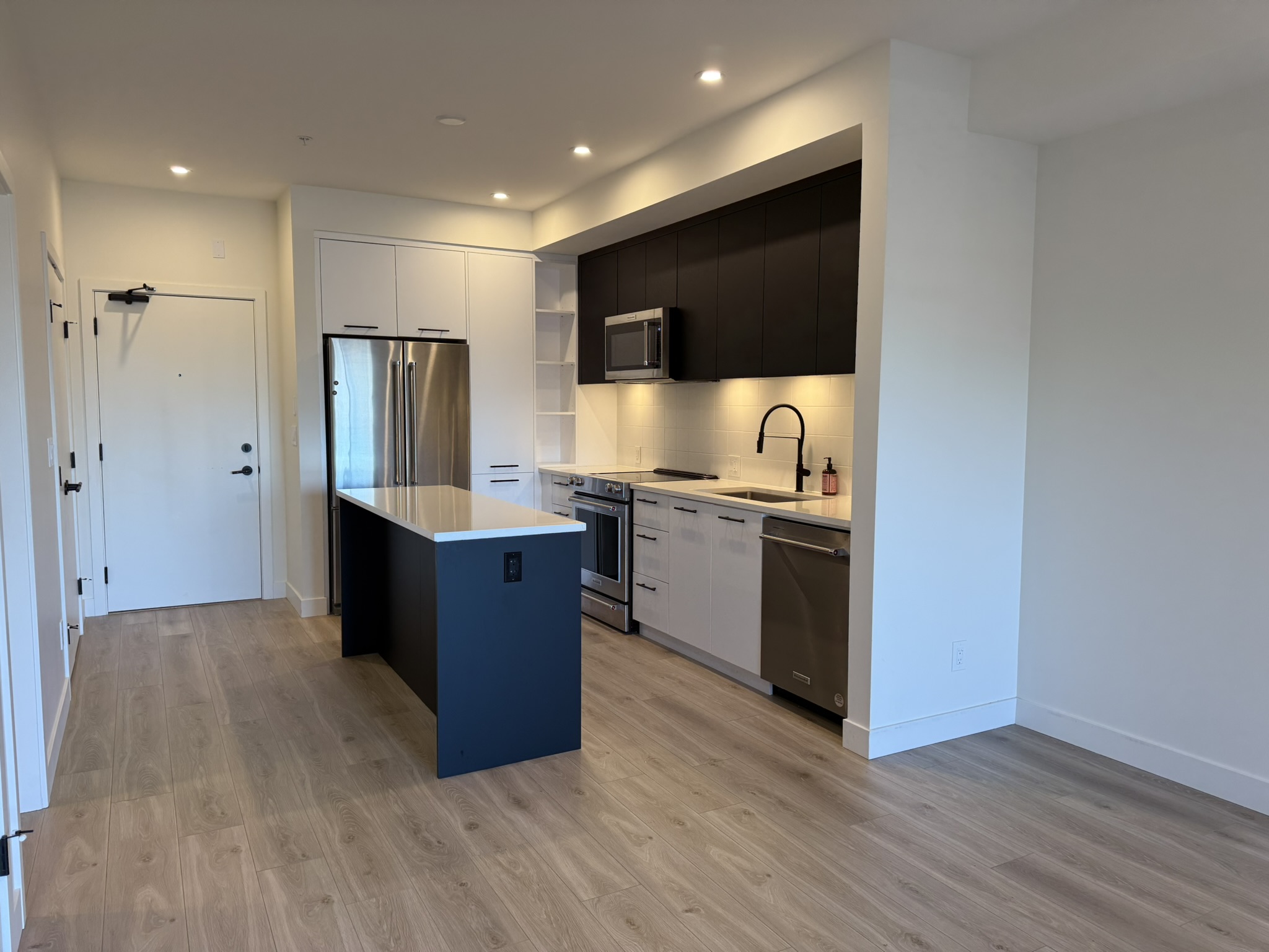 Odyssey, Brand New 1-Bedroom, 1-Bathroom, approx. 700 sq.ft. Interior Highlights: Open-concept, Full-sized stainless-steel appliances, black matte plumbing fixtures, white quartz counters with white tile backsplash, wide plank wood-grain laminate floors throughout, Whirlpool side-by-side washer & dryer in-suite, spacious bedroom with large walk-in closet, modern 4-piece bathroom with access from the bedroom and or kitchen. Private deck with serene views. State-of-the-art, Fitness Centre with sauna, fully equipped lounges, 24/7 security. Includes: 1 storage locker,1 parking, Bike storage available! Building Amenities: Sauna & steam room, Multiple resident lounges (perfect for remote work or entertaining), Rooftop patio (coming soon). Location Perks: Centrally located at King George Blvd & 152nd St, Steps to transit, shopping, restaurants, parks, and Easy access to Hwy 99 & major routes. Small pet negotiable. Mandatory insurance. No smoking or vaping. Rental Property Address: 212-2620 152 Street.Property Manager: Bernadine Nielsen.