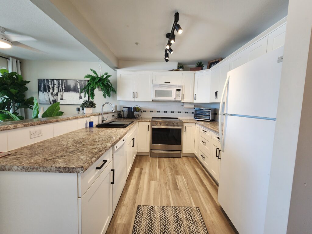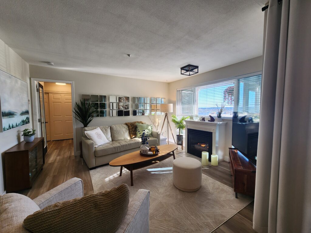 Willowgate. This one is a MUST see! A simply stunning, interior designed and spacious size 750 sq. ft. approx. one bedroom apartment on the 3rd floor of this multi use complex, boasting stunning views of Mount Baker from almost every aspect of the property. The accommodation consists of a good size lounge, lovely fitted kitchen, additional sundeck/solarium with windows that can be opened and which leads out to a beautiful exterior deck with stunning mountain and City views, bedroom, bathroom and a semi den area, that would be ideal as a small home office area. The apartment boasts a wealth of natural light, a secure parking space and is enviably located in Willoughby Heights in Langley, within minutes walk of all major retail stores and transport. GAS INCLUDED! A small pet maybe considered with landlord approval and pet deposit. Tenant insurance is mandatory. No smoking or vaping. $1850.00 per month plus utilities. Available June 1. Rental Property Address: 306-6390 196 Street. Property Manager: Veronica Sharma